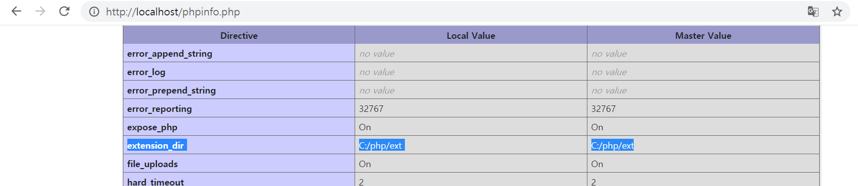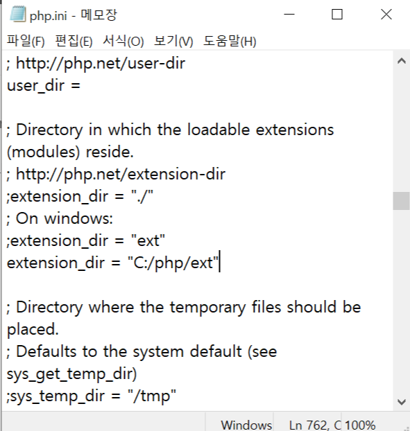 php.ini에서 extenstion_dir = "경로"인데 이 경로는