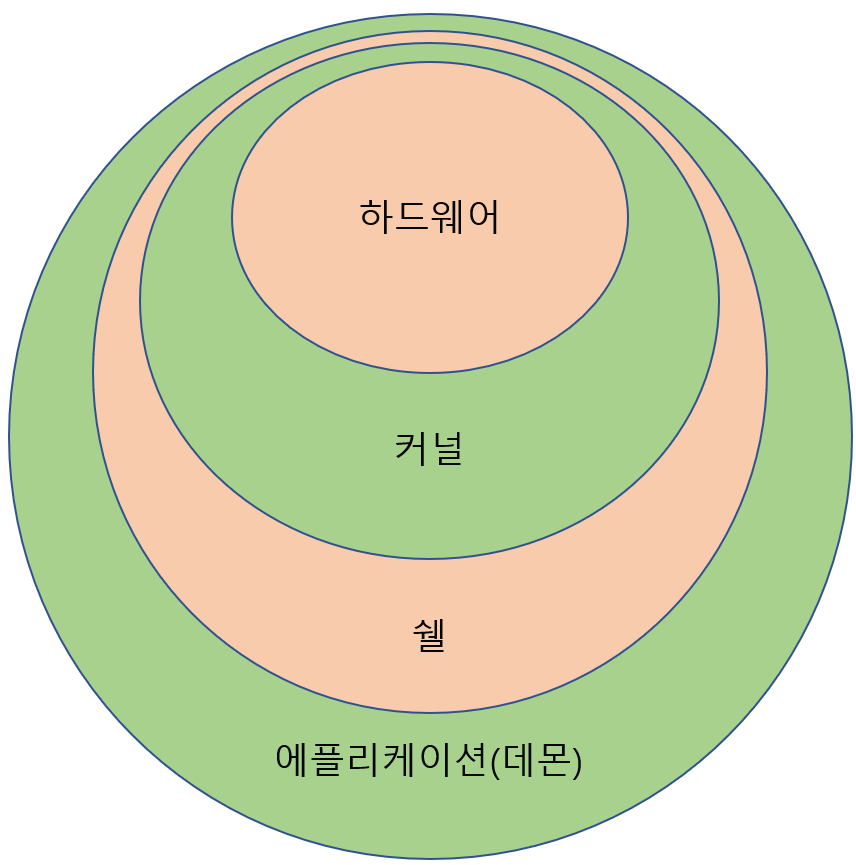 유닉스 운영체제는 바깥의 제일 큰 바탕이 되는 에플리케이션부터 쉘, 커널, 하드웨어로 이루어져 있다.